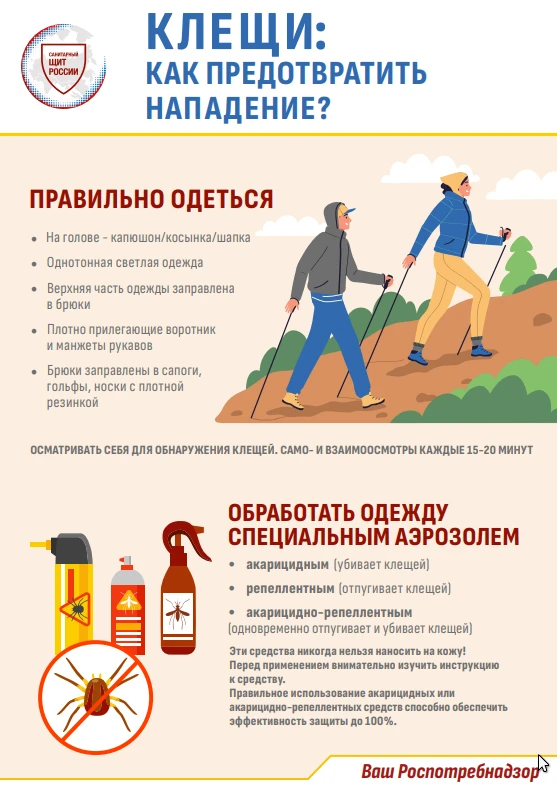 С наступлением тёплой погоды возрастает активность клещей. Напоминаем о необходимости соблюдать меры предосторожности: после прогулок осматривать детей, использовать репелленты, выбирать закрытую одежду. При обнаружении клеща обязательно обратитесь к врачу.